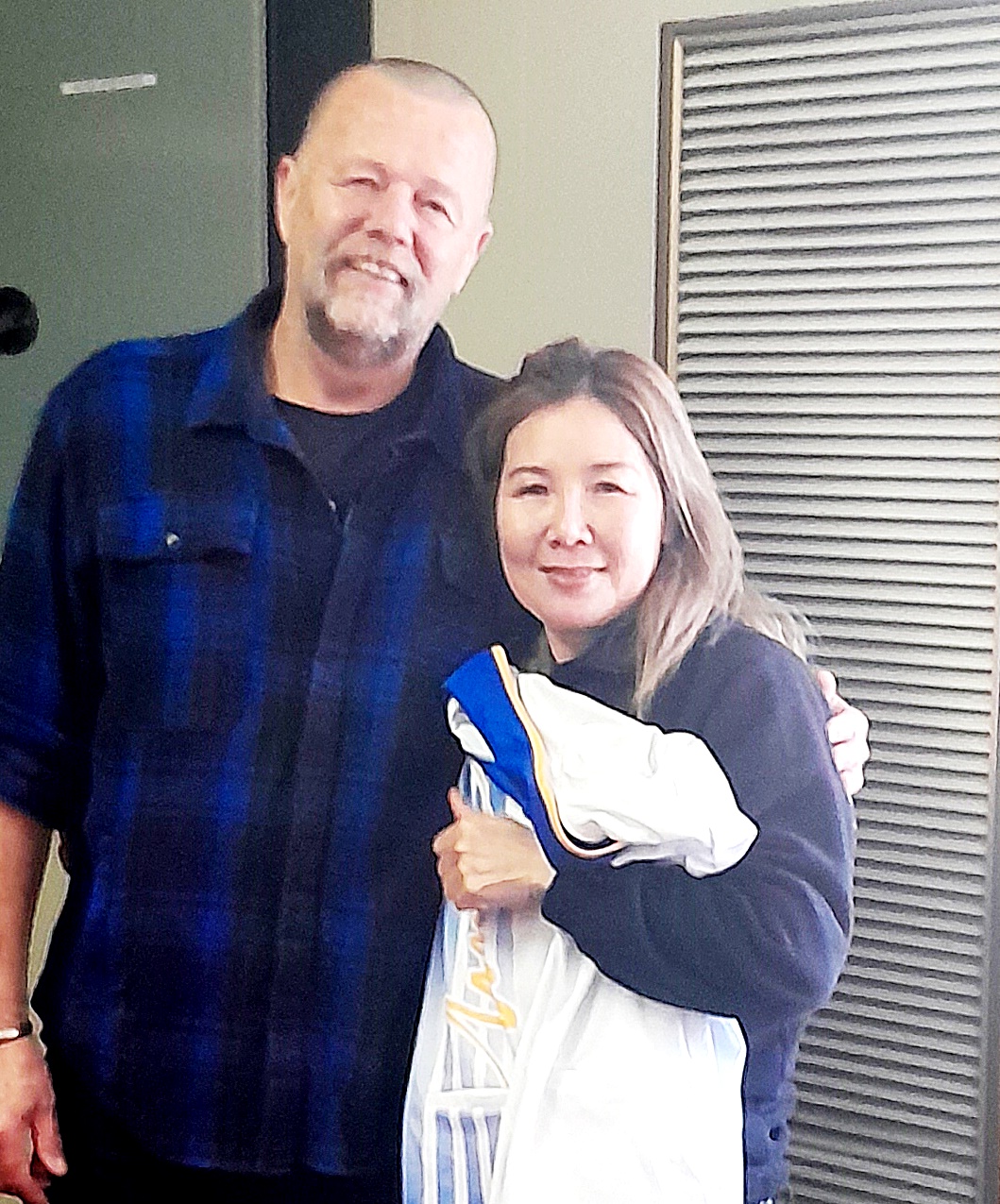 Our new member Salakjit is presented with her club uniform by vice president Brenton.